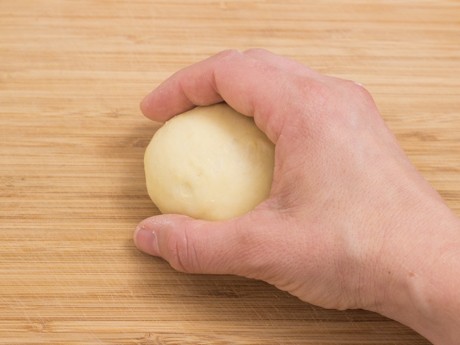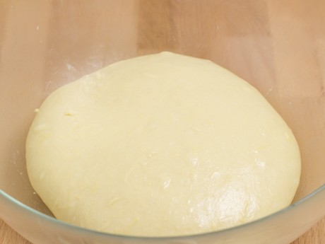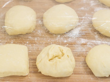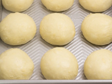 4. Presser légèrement pour faire sortir l’air et travailler la pâte sur la même surface farinée. Diviser la pâte en 12 morceaux égaux (environ 100 g ) et former une boule. Laisser reposer cinq minutes. Avec le creux de la main, rouler chaque boule dans un mouvement circulaire et déposer les boules dans un plat graissé de 9 x 13 po (23 x 33 cm) allant au four. Couvrir d’une pellicule de plastique et laisser doubler de volume pendant une heure.