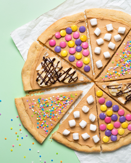 Étendre le fromage à la crème uniformément et décorer de vos garnitures préférées. Nous avons utilisé des mini-guimauves, des confettis, des bonbons au chocolat, des bananes, de la noix de coco et de la sauce au chocolat!