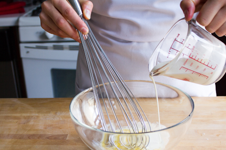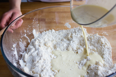 4. Fouetter ensemble l'oeuf, la crème et la vanille dans un petit bol. Ajouter au mélange de farine et remuer doucement jusqu'à incorporer.