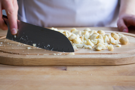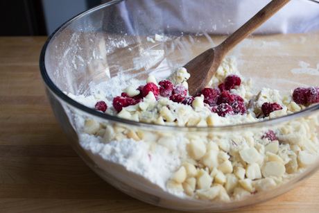 5.Hacher grossièrement les noix de macadam et ajouter au mélange, ainsi que les framboises et copeaux de chocolat blanc au mélange. Remuer.