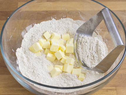 Ajouter le beurre froid et l’incorporer à l'aide d'un coupe-pâte jusqu’à l’obtention d’une texture qui rappelle une chapelure grossière.