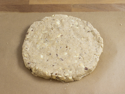 Incorporer les pacanes à la pâte en pliant. Ajouter la crème et mélanger à l’aide d’une fourchette jusqu'à ce que la pâte commence à former des mottes, en ajoutant plus de crème si la pâte est trop sèche. Réunir la pâte et la façonner en forme de boule.