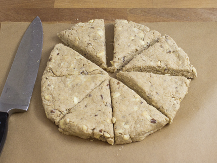 Presser sur la boule pour former un cercle de 8 pouces (1 pouce d'épaisseur) sur une surface légèrement farinée. Couper en 8 pointes et transférer sur la plaque préparée. Mettre au congélateur pendant 10 minutes.