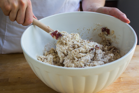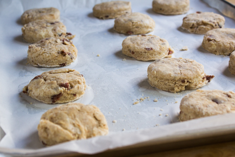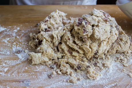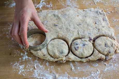 5. Avec les mains, abaisser la pâte à une épaisseur de 1,5 po. À l'aide d'un emporte-pièce rond, découper autant de scones que possible.