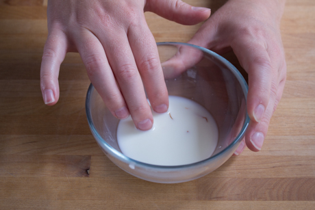 2. Frotter le safran dans le lait chaud jusqu’à ce qu’il se dissoude et laisser reposer de 15 à 20 minutes.