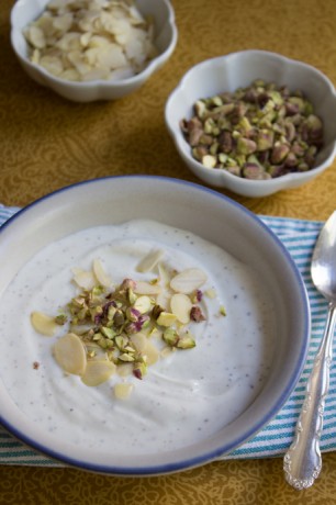 3. Mélanger ensemble le yogourt, le lait au safran et la cardamome dans un bol. Ajouter le sucre 1/4 (62g) à la fois jusqu’à ce que vous ayez atteint le niveau idéal de sucre, selon vos goûts.