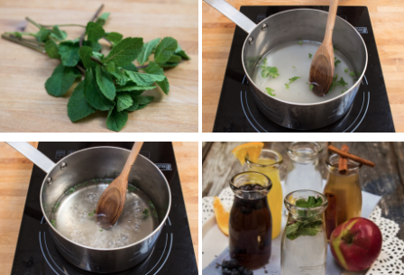Ajouter 1 cuillère à soupe (2 g) de feuilles de menthe fraîche à la recette de sirop simple, en mélangeant avec le sucre et l’eau. Filtrer avant de mettre en bouteille et ajouter une autre cuillère à soupe (2 g) de feuilles de menthe dans le sirop. Sceller et conserver au réfrigérateur.