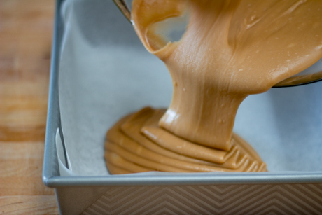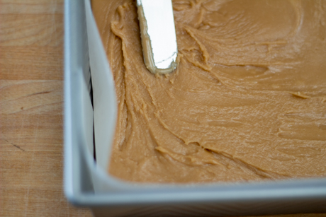 Tapisser le fond d’un moule carré de 8×8 avec une pellicule de plastique ou de papier parchemin, en laissant pendre de chaque côté.