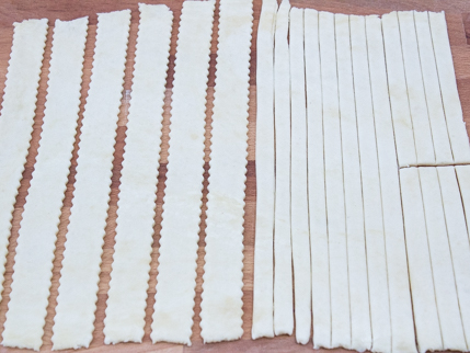 Découper des lanières de pâte comme suit: six de 1 x 10 pouces (2,5 x 26 centimètres) (nous avons utilisé la lame sertie de notre coupe-pâte), 8 de ½ x 10 pouces (1,25 x 26 centimètres) et 8 de ½ x 5 pouces (1,25 x 13 centimètres).
