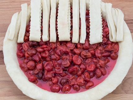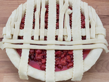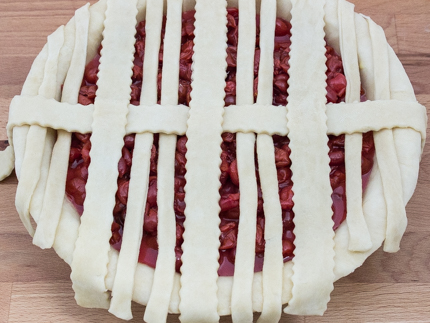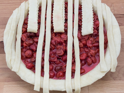 Rabattre les larges lanières passé mi-chemin et déposer une large lanière horizontalement au centre de la tarte. Déplier les lanières pour les déposer sur la lanière horizontale. Rabattre les lanières étroites de la même manière. Déposer deux étroites lanières horizontalement à travers la tarte environ ⅓ de pouce (8 mm) de la lanière du centre.