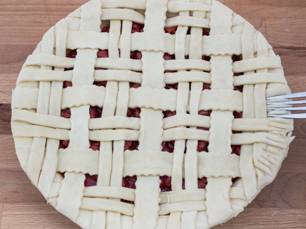 Appuyez sur les lanières du treillis pour les joindre à la coquille de la croûte et tailler l’excédent de pâte. Écraser le rebord à l’aide d’une fourchette.