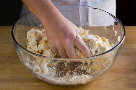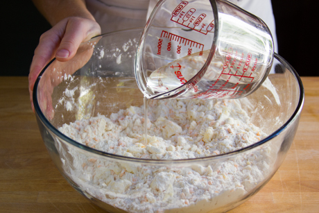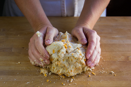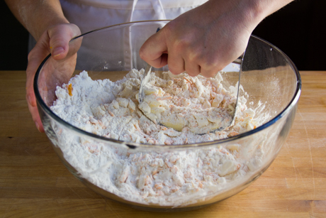 1. Dans un gros bol, mélanger ensemble la farine, le sel et le sucre. En utilisant un couteau à pte, couper le beurre froid et le fromage cheddar dans la farine, jusqu’à consistance grossière.