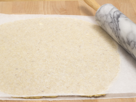 2. Préchauffer le four à 375℉ (190℃) et couvrir une plaque à biscuits d’un papier parchemin. Sur une surface farinée, rouler la pâte en un disque de 10 po (25 cm) de diamètre. Transférer sur la plaque et couvrir d’une pellicule de plastique jusqu’au moment de l’utilisation.