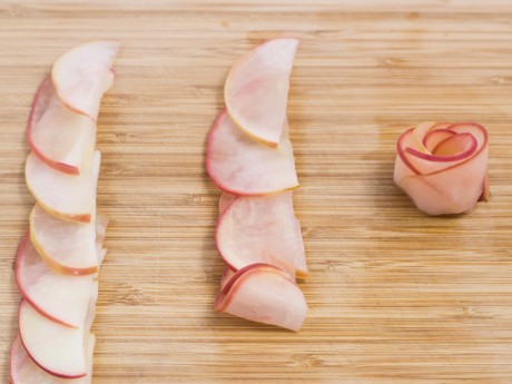 Placer huit tranches de pommes une à la suite de l’autre afin qu’elles se chevauchent. Rouler délicatement pour former un bouton de rose. Prendre le bouton de rose et ajouter des tranches de pommes selon la grosseur désirée.