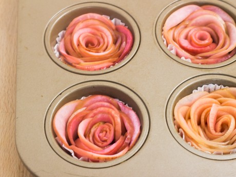 Déposer les roses dans un moule a muffins chemisé ou dans un bol afin que les pommes ne perdent pas leur forme.
