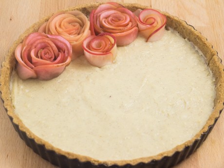 Verser la crème pâtissière et étendre uniformément. Déposer délicatement les roses par-dessus pour recouvrir complètement la tarte. Cuire au four pendant 15 minutes.