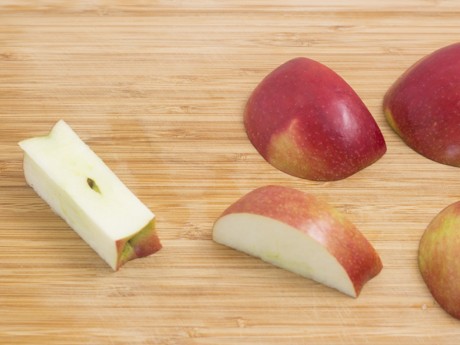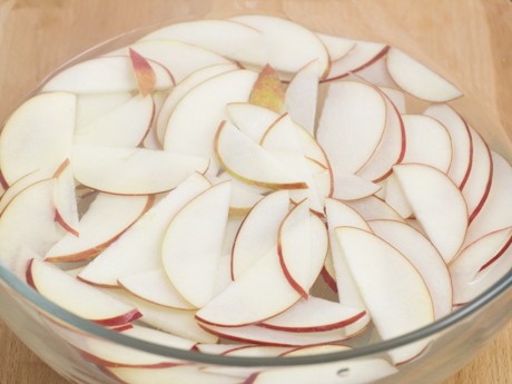 Couper les pommes en laissant le cœur au centre pour obtenir quatre morceaux, puis couper chaque morceaux en fines tranches d’envrion 1/16 po (0.15 cm). Déposer dans le bol d’eau citronnée.