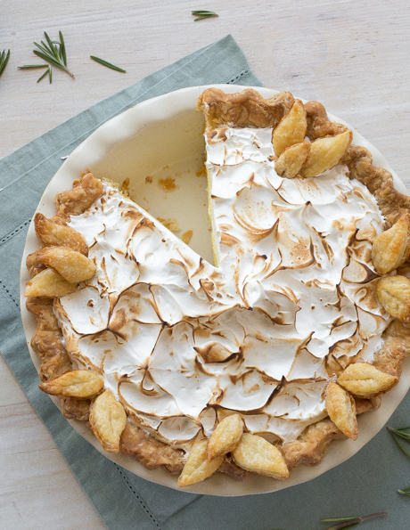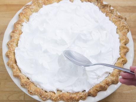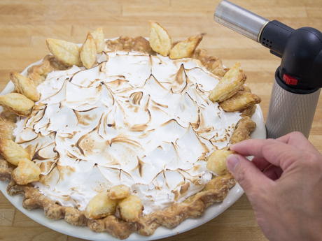 - Étendre la meringue ou utilisez une douille. Si désiré, brûler la meringue à l’aide d’un chalumeau. Garnir la tarte des feuilles décoratives et servir immédiatement. Conserver au réfrigérateur dans un contenant hermétique.