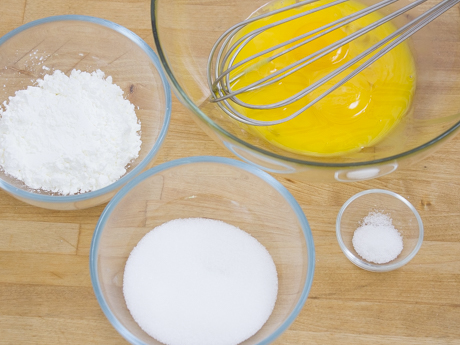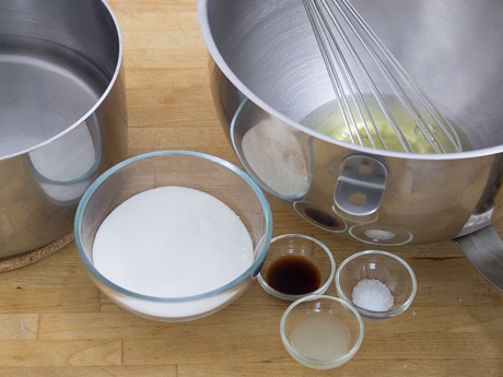 Une fois le lait infusé, fouetter les jaune d’oeufs avec le ¼ tasse (50 grammes) de sucre restant, la fécule de maïs et le sel.