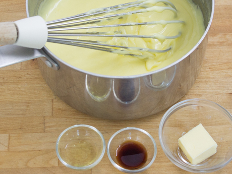 Ajouter graduellement le lait chaud au jaunes d’oeufs pour ne pas les cuire et fouetter constamment. Passer la préparation au tamis puis remettre dans la casserole. Jeter les solides. Faire chauffer à nouveau et fouetter constamment jusqu’à ce que la préparation se mette à bouillir et épaississe. Calculer une minute à partir de ce moment. Retirer du feu et ajouter en fouettant le beurre, l’extrait de citron et de vanille.