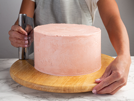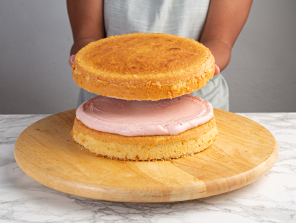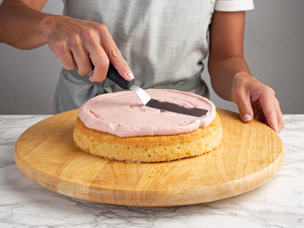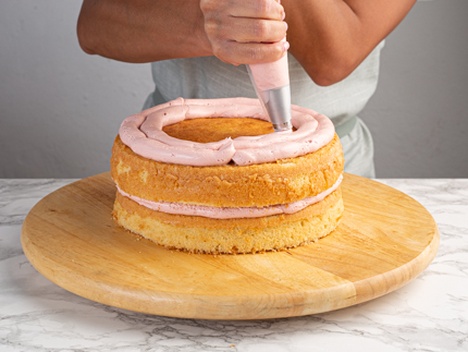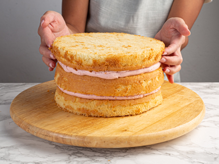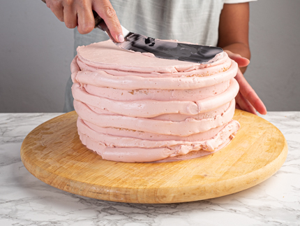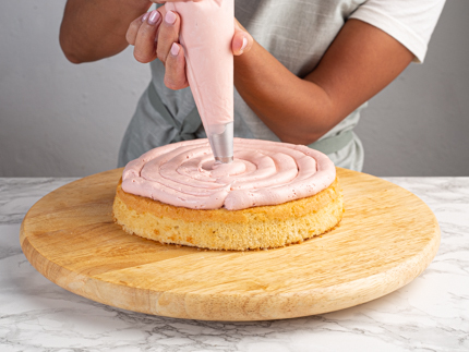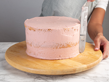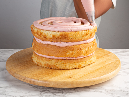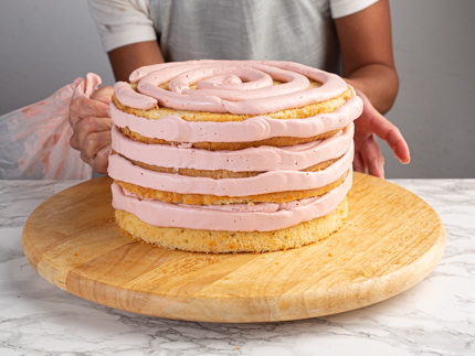 Back to Recipes & More1. Place one of the bottom layers onto the cake stand or platter. Transfer ⅓rd of the buttercream into a piping bag fitted with a round tip. Pipe concentric circles onto the layer, and with a small offset spatula smooth out the buttercream. Place the matching top of the cake layer onto the buttercream, gently pressing down to adhere the layer onto the frosting.