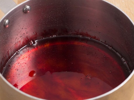 4. When temperature is reached, remove saucepan immediately from heat, and stir in the food-colouring. Place beside prepared baking sheet.