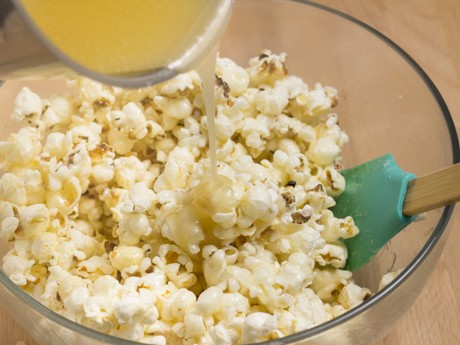 4. Pour mixture over popcorn, continuously stirring with a spatula or wooden spoon while doing so, to ensure all popcorn kernels are coated.