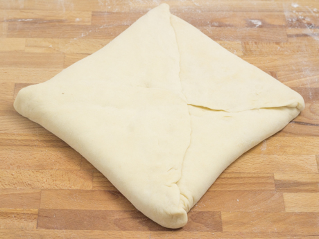 6. On a floured surface roll the chilled dough into a 10 inch (25 centimetres) square. Place the butter in the centre of the dough at a 90 ° angle so the corners of the butter are in the centre of each side of the dough. Fold the corners of the dough over the butter and pinch edges to seal.