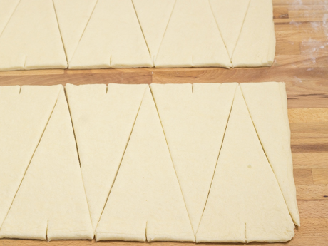 8. Roll out the chilled dough into a rectangle 15 x 16 inches (38 x 41 centimetres). Using a sharp knife or a pizza cutter, cut the dough in half lengthwise to form two 15 x 8 inches (38 x 20 centimetres) rectangles. Cut each rectangle into six triangles 8 inches (20 centimetres) in height and 4 inches (10 centimetres) wide at the base. Cut a ½ inch (1.3 centimetres) slit in the centre of each triangle base.