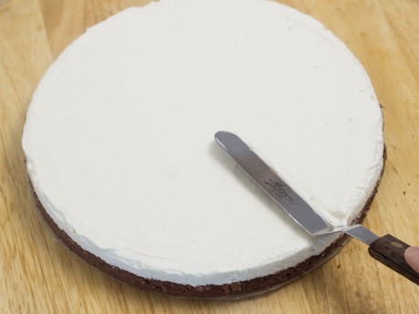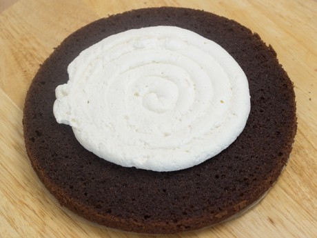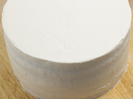 11. Spread a thin layer of whipped cream onto the top and sides of the cake, this is the crumb coat. Place into fridge to set up, about 15 minutes. Evenly spread the remaining whipped cream onto the tops and sides of the cake, reserve some whipped cream to decorate the top.