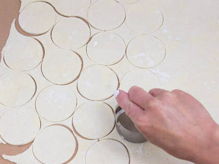 Make pie crust as directed in the recipe Perfect Pie Crust. Place some of the pie dough that has been rolled to ⅛ to ¼ inch thickness (13 inch circle) into a 9” or 9 ½” pie dish. Crimp edges. Cut out 2” circles (or desired shape) using a cookie cutter from the other half of the pie dough that has been rolled out. Place cutouts onto a parchment lined baking sheet. Chill the cutouts and the lined pie dish until needed.