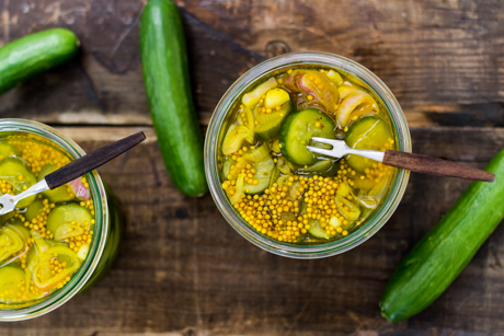 Use tongs to carefully remove the jars from the hot water. Use oven mitts or a towel while handling the jars to protect against burns. Tightly pack cucumber mixture into still-hot jars to within 1 inch of rim, then cover with liquid, leaving 1/2 inch headspace. Use a wooden spoon or chopstick to remove any air bubbles from the jars. Simply insert and gently wiggle around to release any air bubbles trapped inside.
