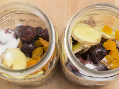 4. In each jar place 1 cup (200 g) cherries, 2 tbsp (19 g) dried apricot, 2 tbsp (25 g) Redpath® Organic Sugar, 2 tbsp (30 ml) whey and 5 ginger slices. Top the jars with the cooled, boiled water. Cover the jar and shake gently to mix the contents.
