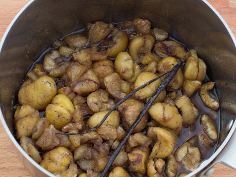 Place the peeled chestnuts into a medium pot with 1 cup (180 millilitres) water, Redpath® Golden Yellow Sugar, vanilla bean seeds and vanilla bean pod, if using. Set over medium-low heat and bring to a simmer; 20 minutes.