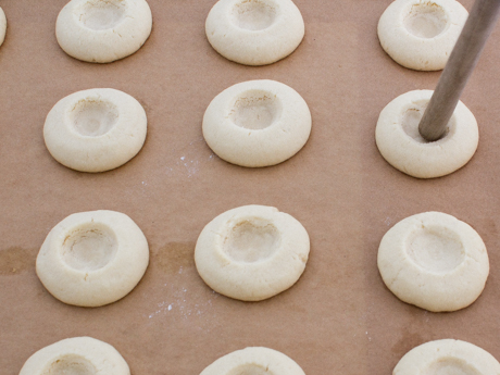 Roll dough into 1 ½ inch (3.75 centimetre) balls and place on cookie sheets 2 inches (5 centimetres) apart. Flatten balls slightly and use your finger, or the handle of a wooden spoon dipped in flour, to create an indentation about ½ inch (1 centimetre) in diameter.