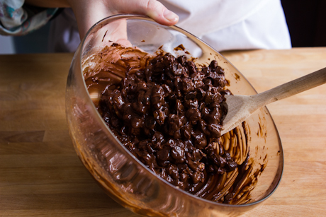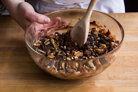 6. Stir in the flour mixture, then the chocolate chunks and nuts.