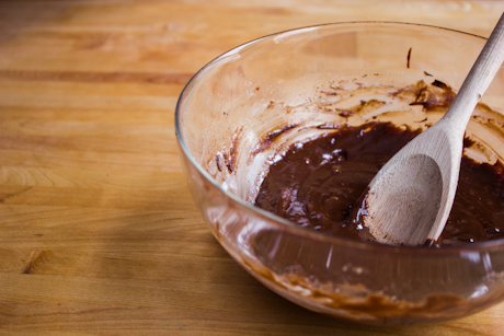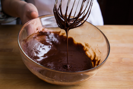 5. Briskly whisk a small amount of the melted chocolate into the egg mixture, then slowly add in the remaining chocolate while whisking.