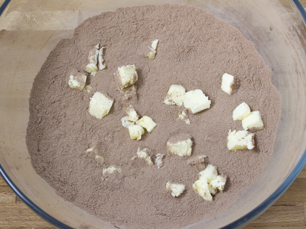 - Add the butter. Using a pastry blender, or two butter knives, cut in the butter until it resembles coarse crumbs (with a few pea-sized pieces).