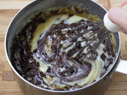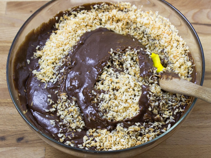 - Add the vanilla and chopped chocolate to the custard and stir until smooth. Fold in the toasted coconut.
