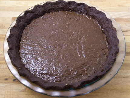 - Pour into the cooled crust and chill for a minimum of 3 hours, or up to overnight. After 3 hours, cover pie with plastic wrap (if pie is wrapped earlier, condensation may form and drip on the surface of the chocolate filling).
