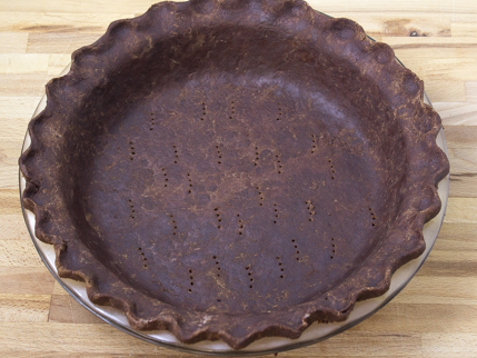 - On a surface lightly dusted with cocoa, roll pie dough into a 14 inch (26 centimetre) circle. Transfer the dough to a 9 inch (23 centimetre) pie dish, and gently press into the dish. Trim overhanging dough so that ½ inch (1 centimetre) remains outside the pie dish. Fold under the overhanging dough and flute the edges (take a look here to see how it’s done). Prick the crust, all over, with a fork.