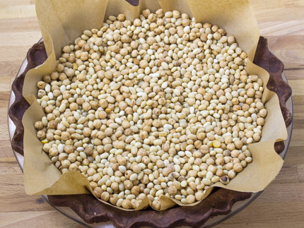 - Line the chilled crust with foil or parchment paper and fill with pie weights, beans or rice.