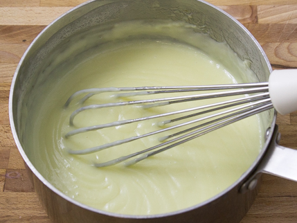 - Whisking continuously, slowly add the hot coconut milk to the egg yolk mixture. Once all the milk is incorporated, pour the custard back into the pot. Stir over medium heat until the mixture boils and thickens; 4 to 5 minutes.