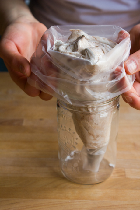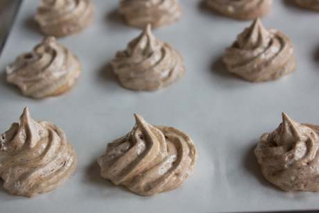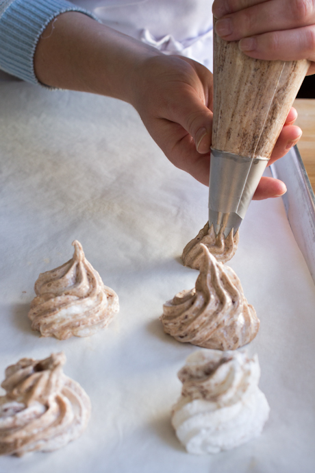 9. Fit a piping bag with a large star tip, then place it in a tall glass or jar, icing tip down, and fold over the sides of the bag. Fill the piping bag with meringue, then lift up the sides and twist tightly to close the bag. Pipe swirls of meringue on the parchment lined baking sheets.