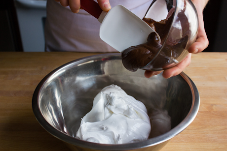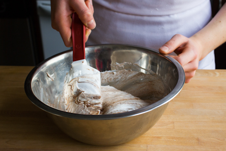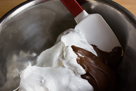 8. Remove the bowl from the mixer and add in the softened peanut butter chocolate spread. With a rubber spatula, gently fold the spread into the meringue three or four times. You’re aiming for a swirled effect so don’t over-mix. This will help to prevent the batter from deflating.