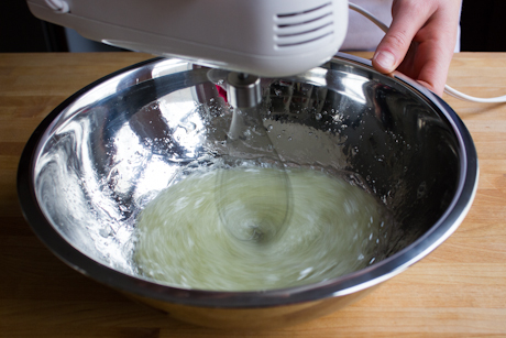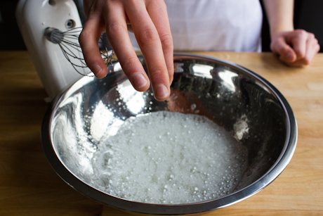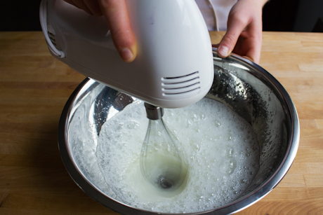 4. Place the egg whites in the bowl of a stand mixer, fitted with the whisk attachment, or in a large stainless steel bowl and using electric beaters. Beat on medium-high until they are completely foamy.