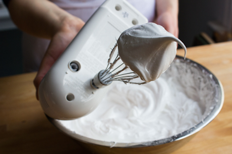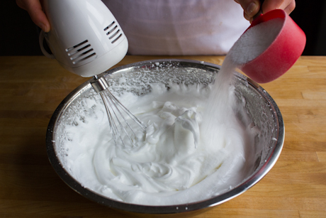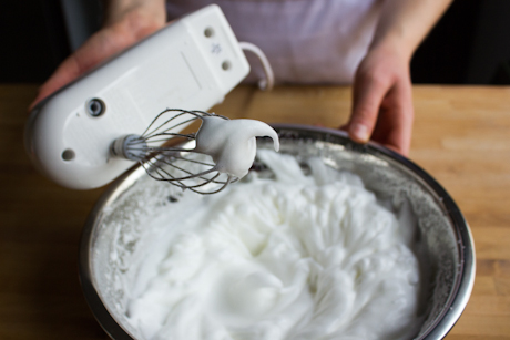 7. Once all the sugar is in, the meringue batter should start to become very thick, almost stiff, and when you lift the whisk firm peaks should remain.