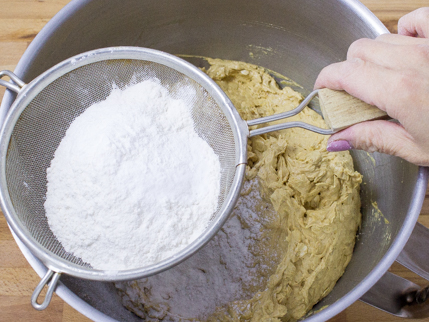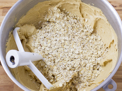 - Add in the oats, mixing on low speed until just-combined. Sift in the flour, baking soda and baking powder. Mix until combined.