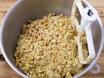 - Add in the roasted peanuts and peanut butter chips. Mix on low speed until distributed evenly throughout the dough.