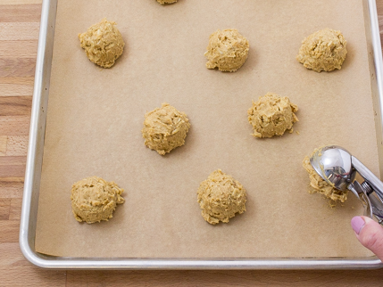 - With a small ice cream scoop, scoop even-sized rounds onto the parchment-lined baking sheets.